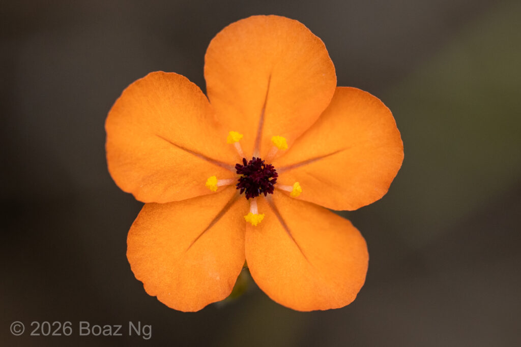 Drosera actinioides is a small sundew, with rosettes that reach 2-3cm in diameter. The leaves are numerous and semi-raised, with round laminae and long, thin petioles. There are spiky stipules at the base of the leaves. The flowers are metallic orange, reaching around 1.5-2cm in diameter. The styles are blackish red, forming stubby, fleshy, highly divided clusters. Some populations have white styles. The pedicels are pendulous when in fruit. The flower scape is long, reaching around 30-50cm tall, and is coloured dark red near the base.