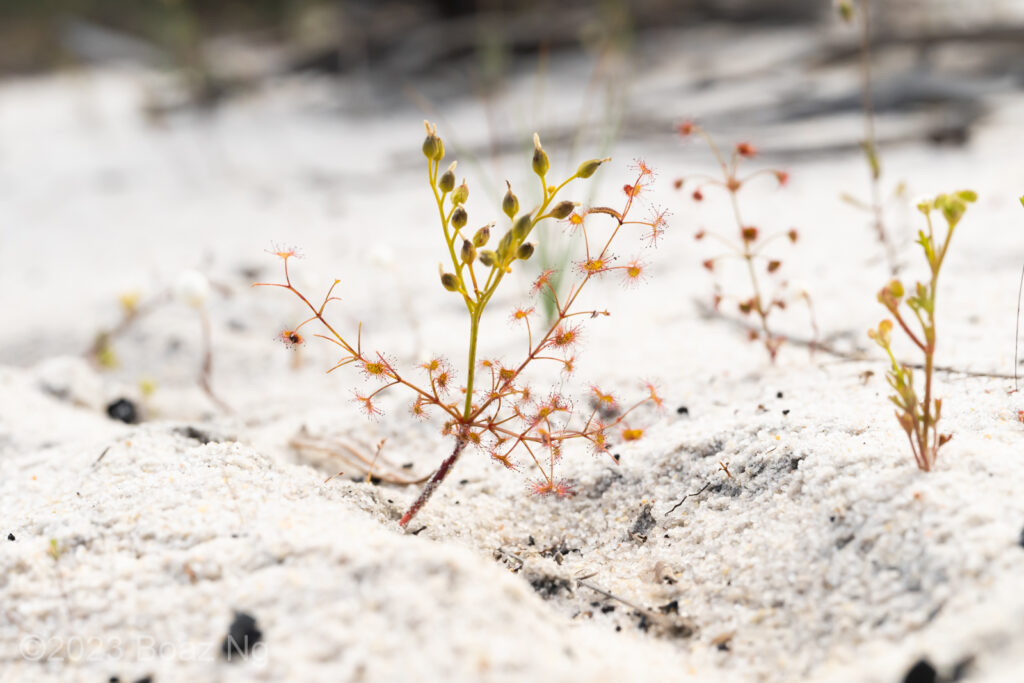 Drosera humilis is a medium sized sundew that grows to around 15 cm in diameter. The species has around 3-5 thin, semi-erect stems that radiate from a central point at the surface of the substrate. The leaves have long thin petioles with laminae that are deeply notched at the top. The flowers are borne on a branching upright inflorescence that emerges from the center of the plant. Oftentimes, the flowers emerge prior to the leaves.