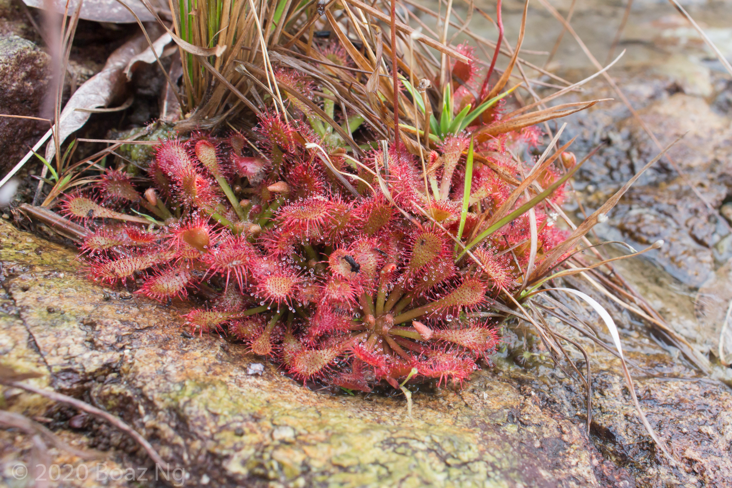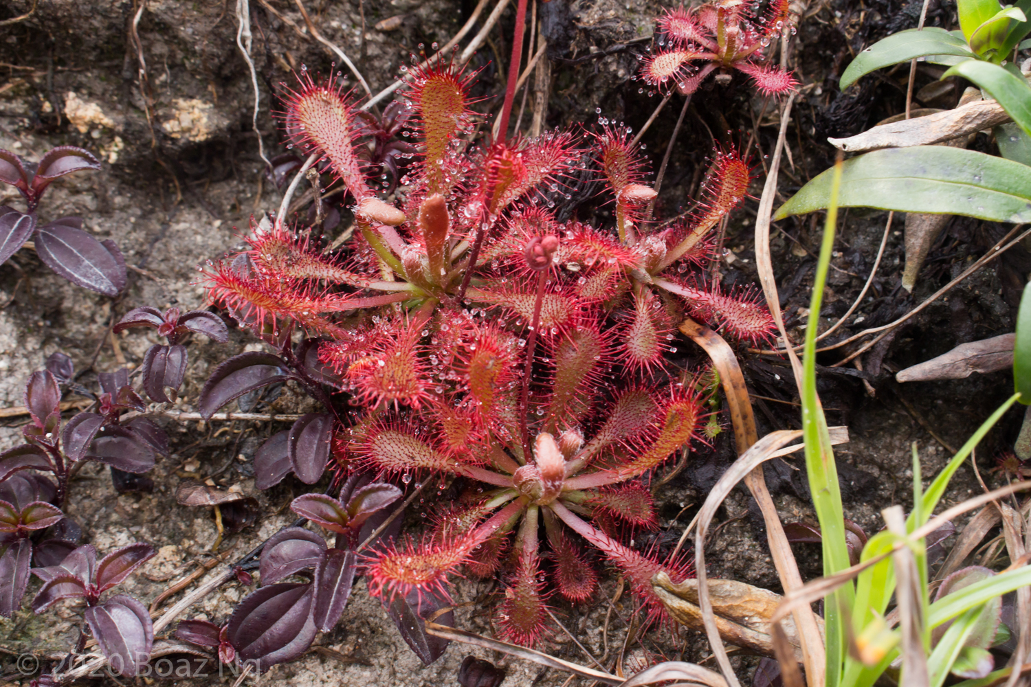 Also growing on Lantau Island is an interesting dwarf red form of Drosera spatulata with a long petiole out of which abruptly terminates in a rounded petiole. I suspect that long petioles might be the result of introgression with D. oblanceolata. The population is somewhat threatened by the more vigorous hybrid, which might out compete the variety.