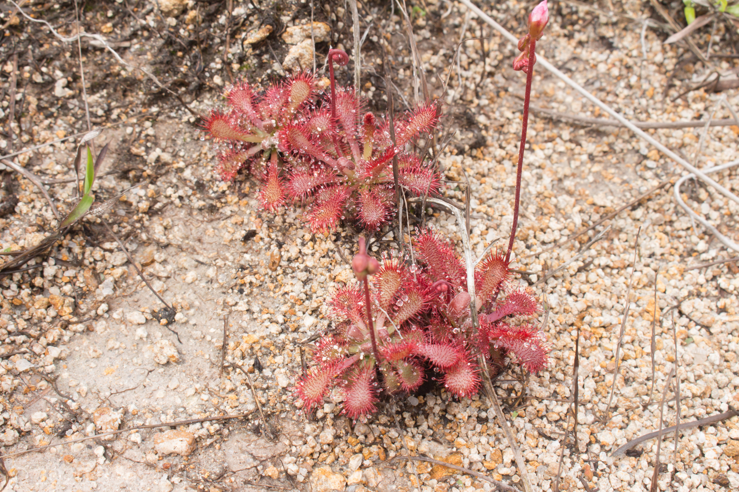 Throughout Hong Kong, the standard form of Drosera spatulata (D. spatulata var. spatulata) can be found growing in seepages, road cuts and creeks. This form has a gradual transition between the petiole and lamina, with a tentacle density that gradually diminishes towards the centre of the plant. The plants in Hong Kong are small, reaching a diameter of around 2-3 cm.