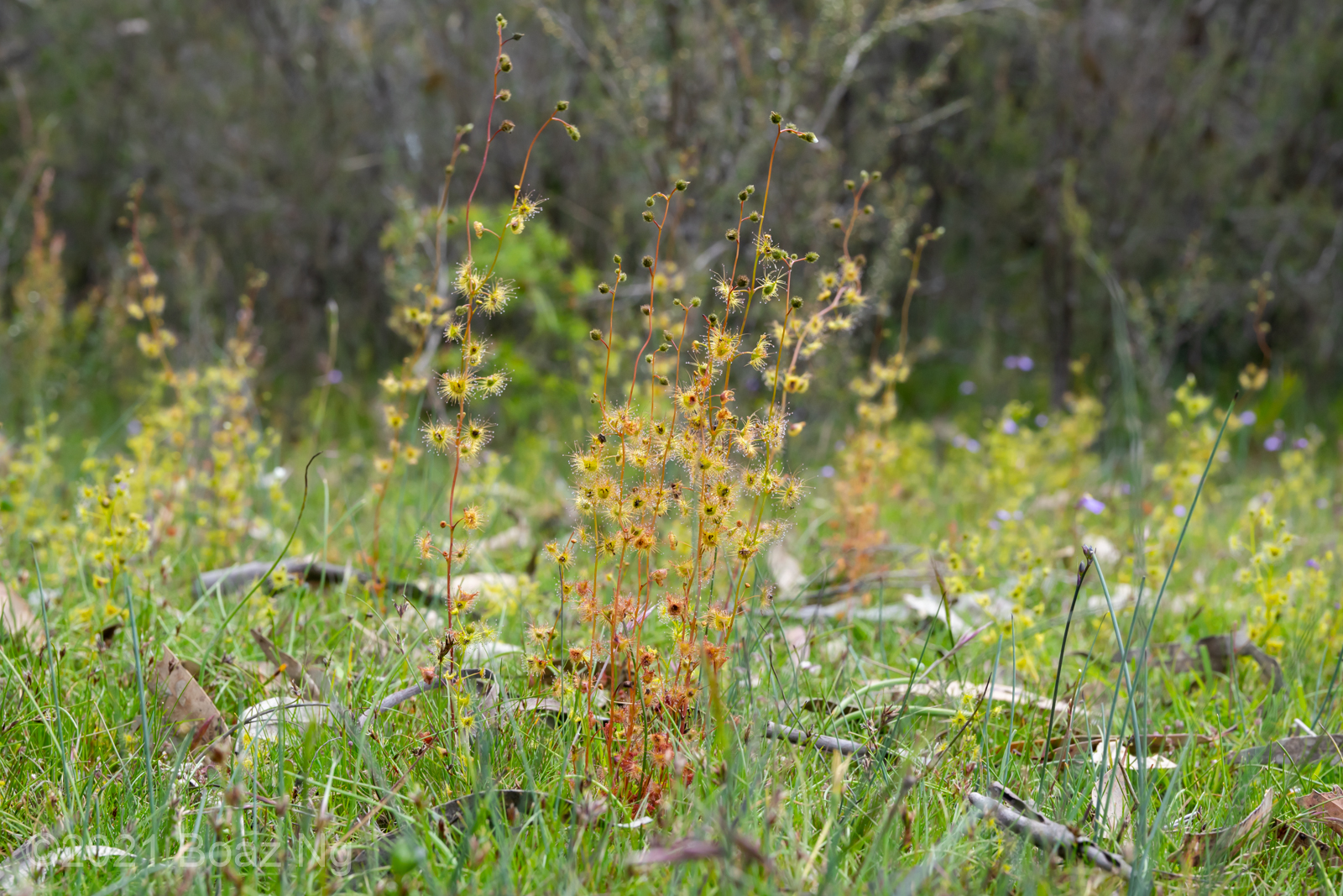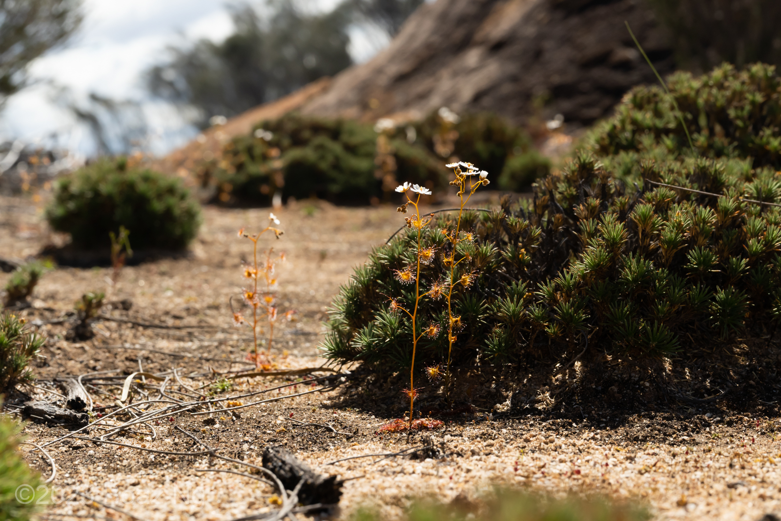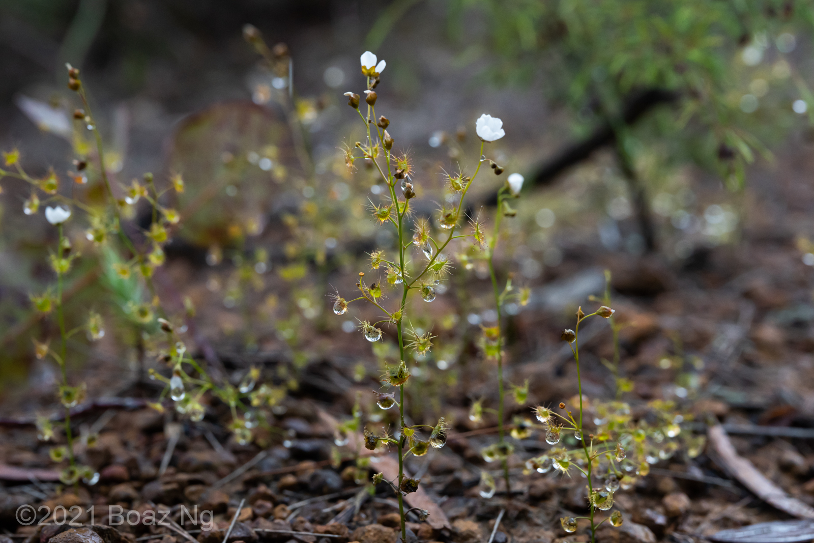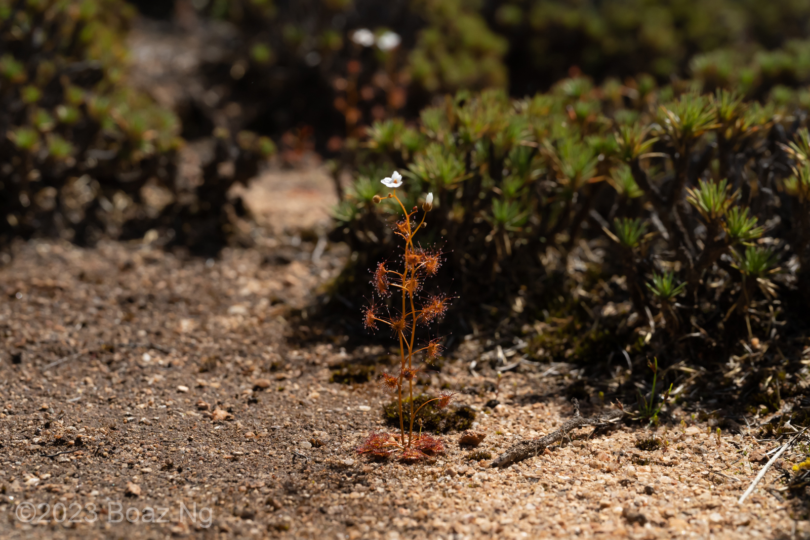 Having seen across VIC and NSW, I agree with de Salas’ view that Drosera gunniana should be separated from D. hookeri. Traits that can be used for its distinction from D. hookeri include a longer stem that branches few times if at all, larger flowers that are usually pink, stems and leaves that are usually olive in colour (rarely red) and smaller seeds that are less strongly ‘bottle’ shaped with a shallow texture. It tends to grow in compacted clay within open woodland and on mossy seepages atop rock outcrops. It should be noted that a similar taxon is present in coastal regions of central NSW to SE QLD but differs from the standard form in that it has sepal surfaces that are variably hairy, fimbriate sepal margins and vivid pink blooms. These plants are currently generally included under D. gunniana but may represent a new taxon.