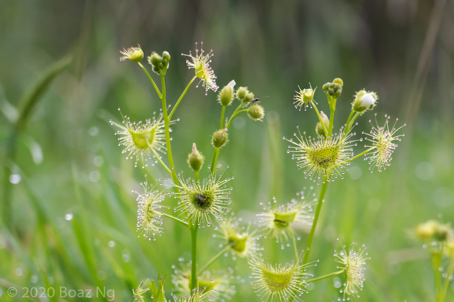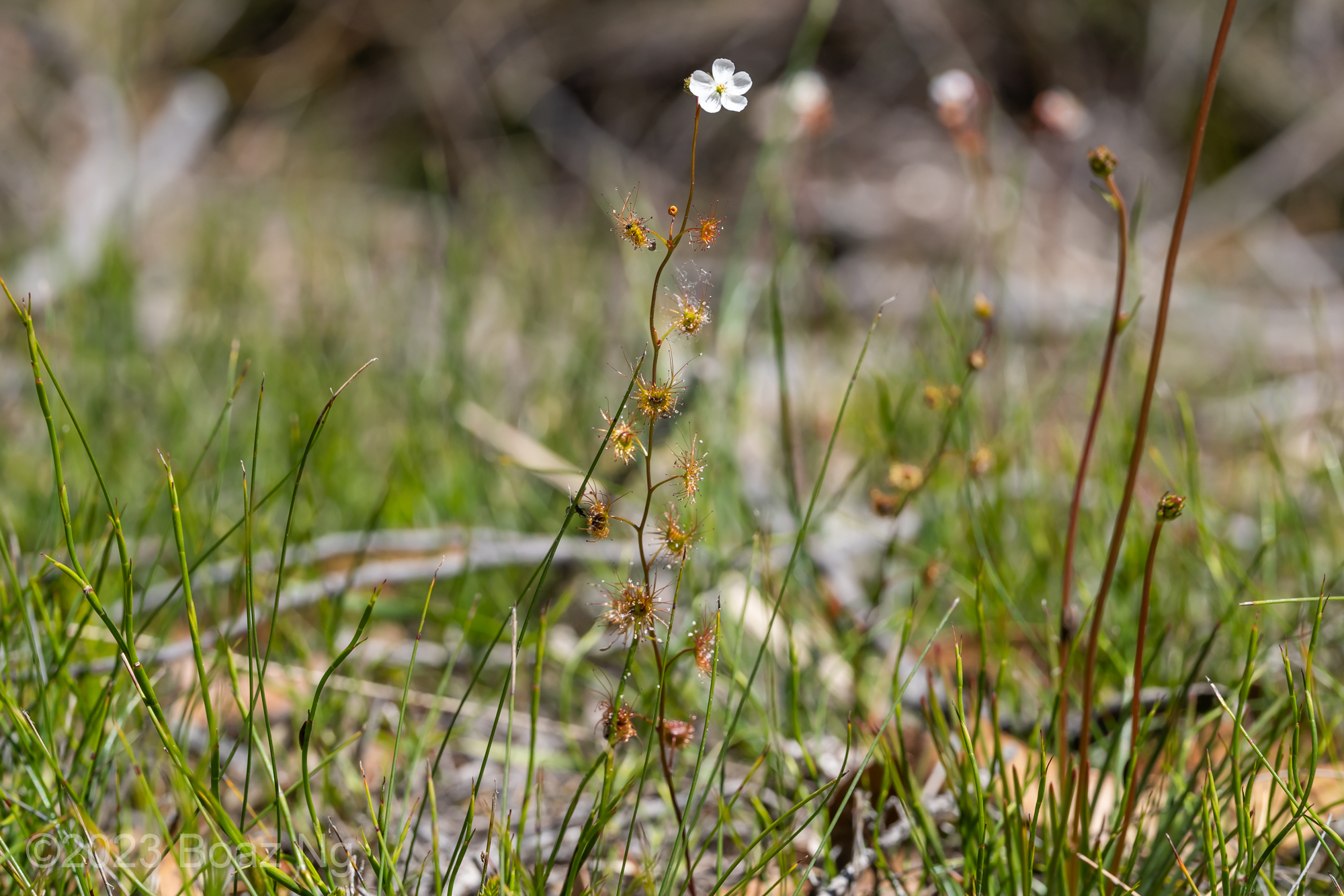 Of the plants with strong basal rosettes and short inflorescences, Drosera hookeri R.P.Gibson, B.J.Conn & Conran (Figure 5) is the least ambiguous. It was first described as Drosera foliosa by Hooker in 1948, but the name was invalid as there was no clear type specimen assigned, so Gibson et al. 2010 assigned a lectotype of a short, multibranched plant from the Midland region of Tasmania and renamed it Drosera hookeri. This species is recognised by its bright green foliage, very robust basal rosette in flowering specimens, branching nature, short stems, small white flowers and ‘bottle shaped’ seeds with a deeply pitted texture. Under my observation of the species in Victoria, it prefers winter-wet grassy clearings in disturbed woodland and the wet periphery of seasonal swamps.