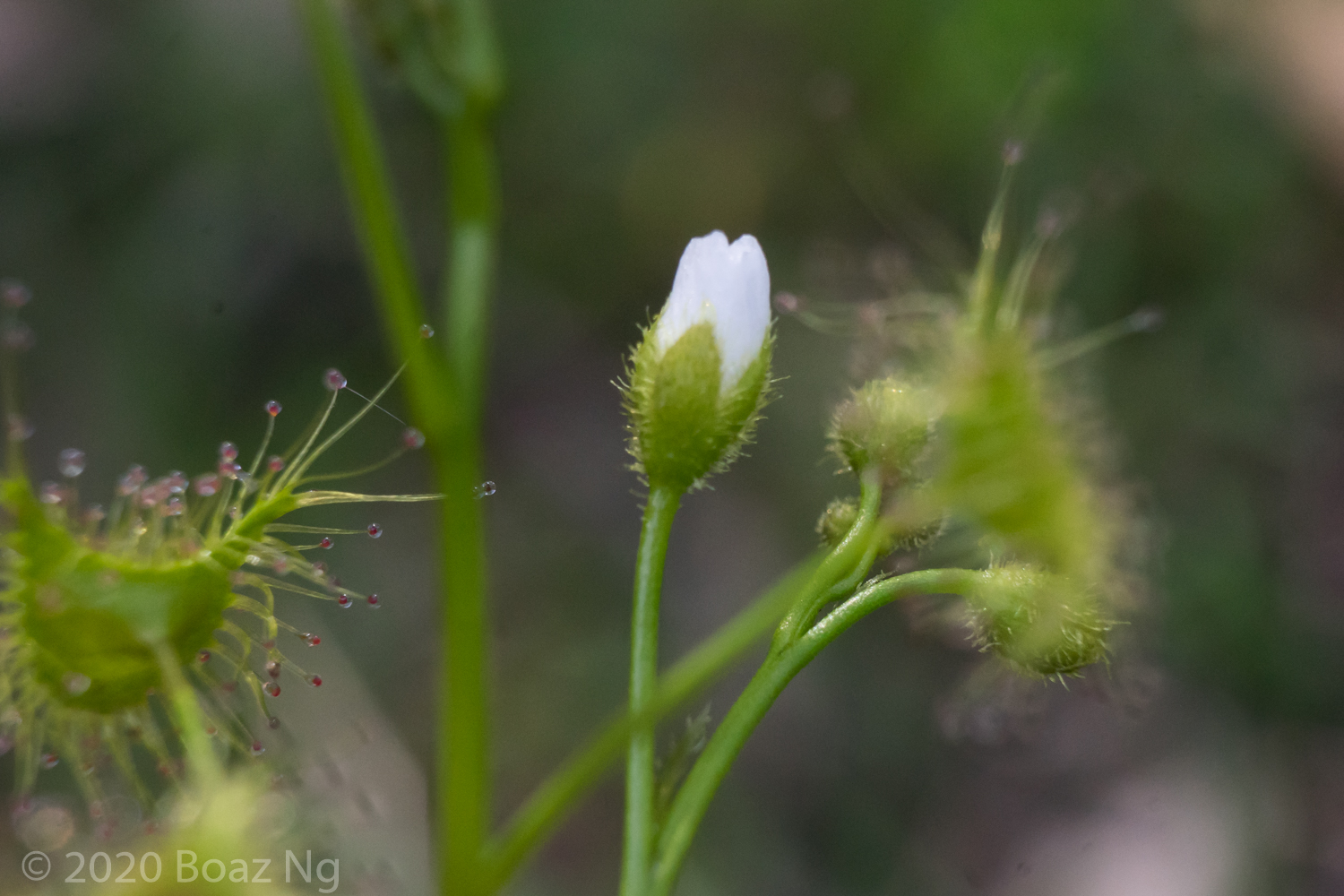 | Drosera bicolor | Small, tight rosette with very short petioles. | White with notched edges and red dot at center. Styles clustered into short clump. | Unbranched | Hairy. Hairs short and gland-tipped | Small and round |