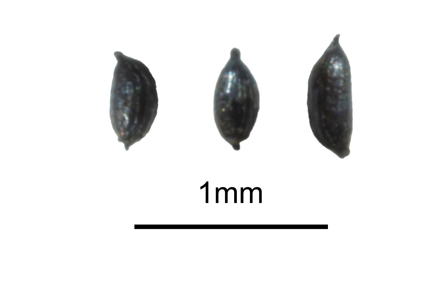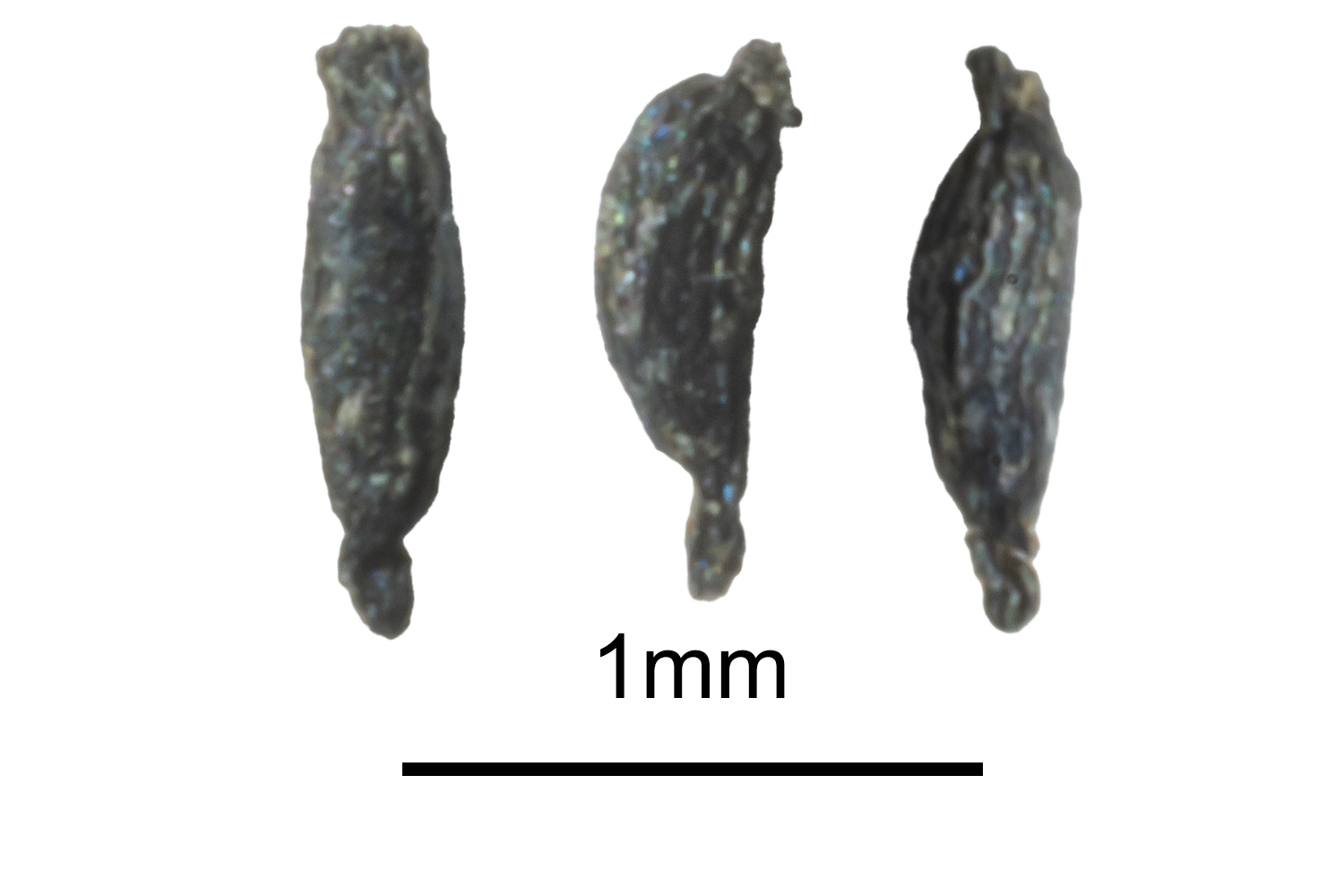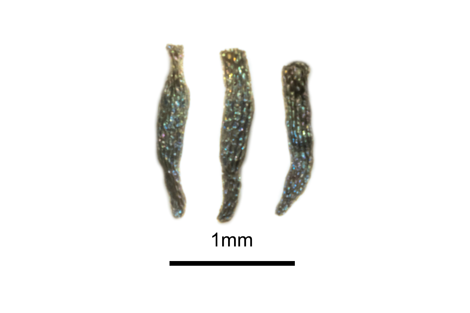 | Drosera hookeri | Always present. Robust basal rosette with thick petioles and large laminae. | Usually white. Styles white. Flower buds comparatively small. Flowers clustered on a short inflorescence. | Frequently branched on the lower two thirds of the main stem. | Hairy. Hairs shorter | Oval with a large lobed appendage at one extremity. Shaped like a stubby beer bottle. Reticulated surface pattern with deep texture. |