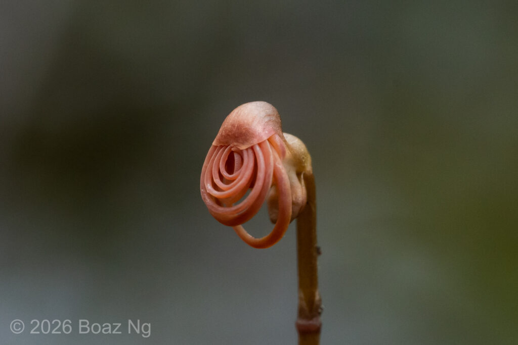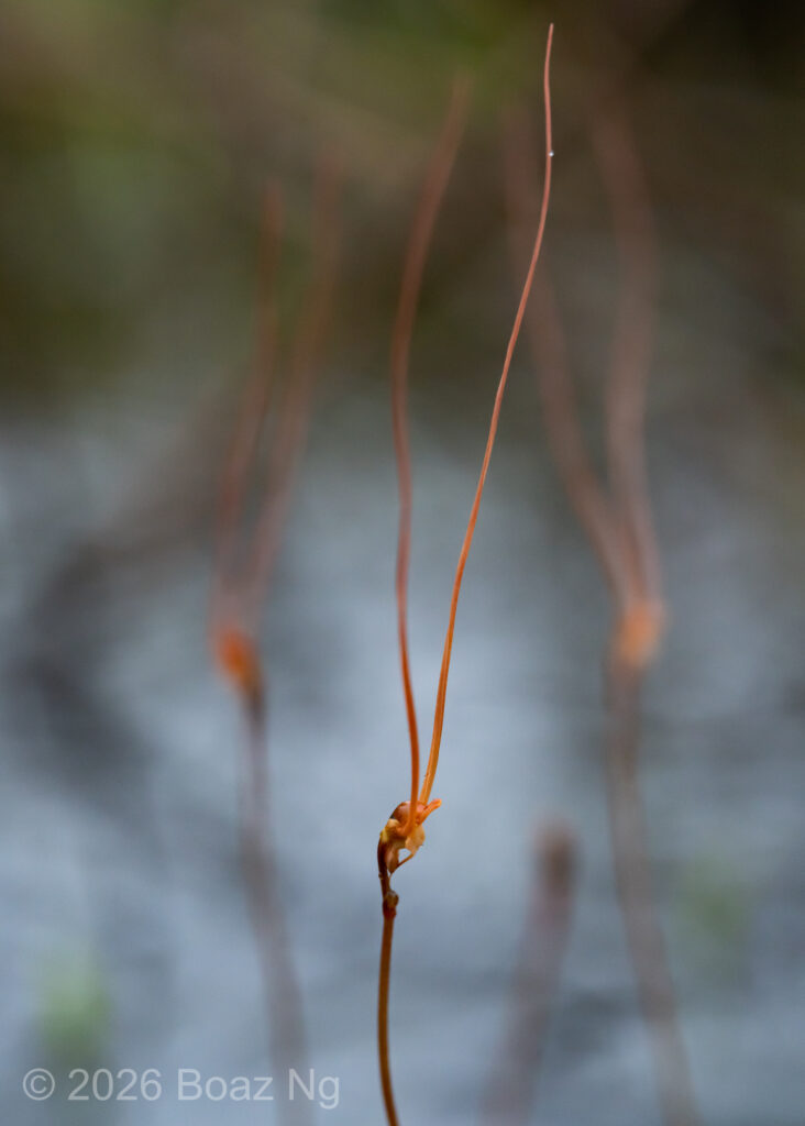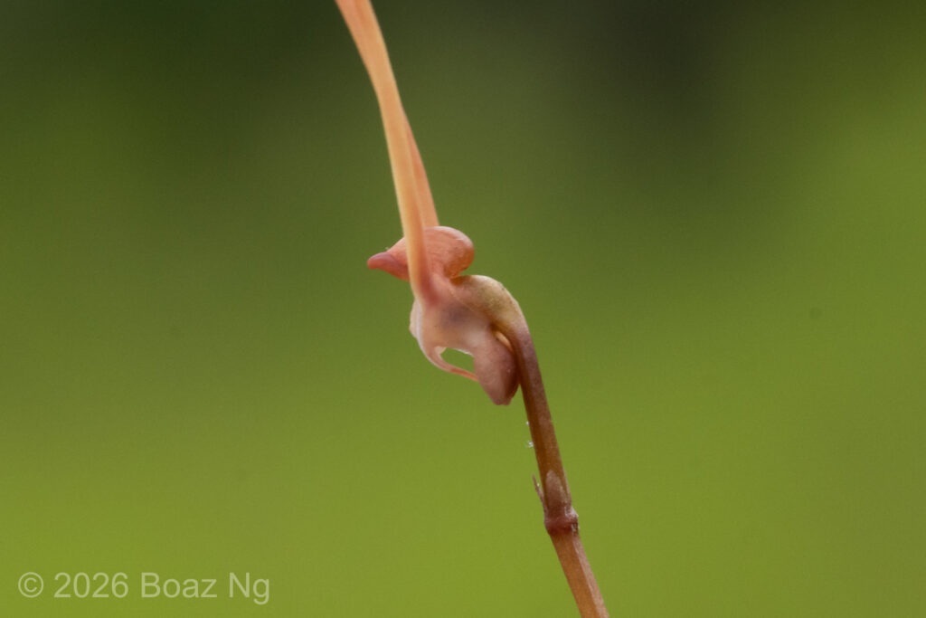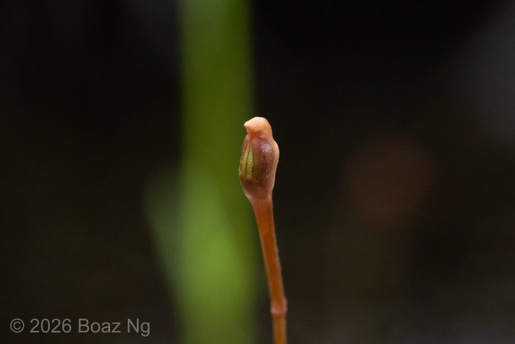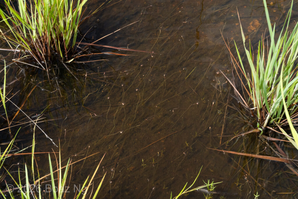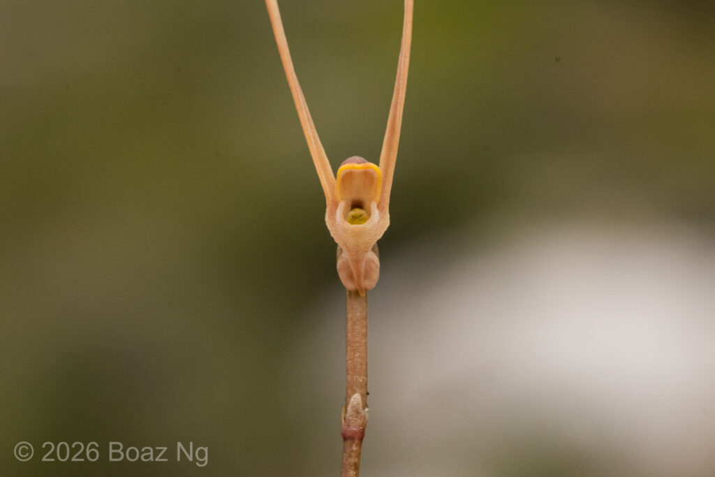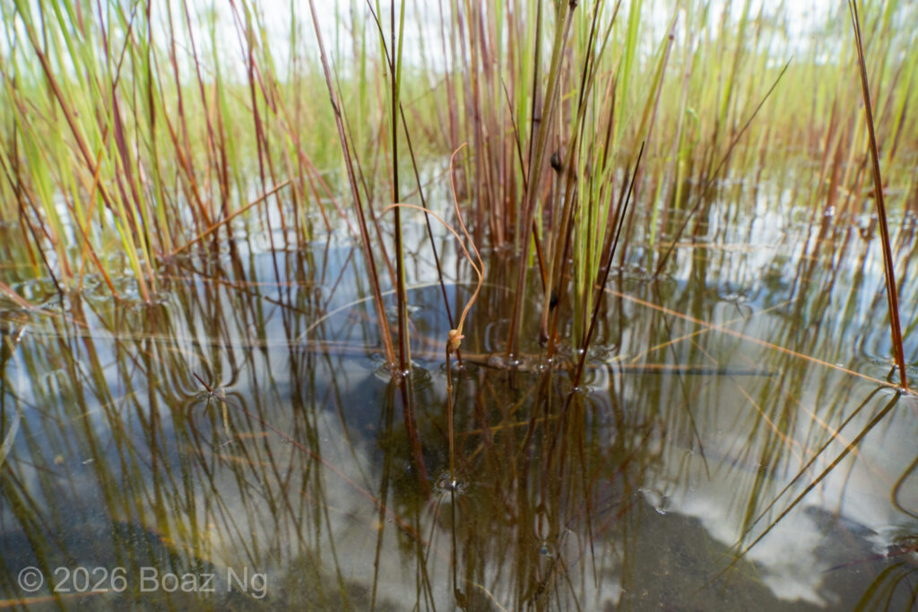 Utricularia albertiana is a medium sized bladderwort, with flowers about 4-5 cm in length. Its antennae are filiform, upwards pointing and are produced from the edge of the lower corolla lip. The lower corolla lip has a single lobe that forms a sharp, downwards-pointing projection. This lobe is usually longer than the length of the spur. The edge of the lower corolla lip is slightly flared outwards. The upper corolla lip is short and hooded. The spur is ‘scrotiform’, expanding at the extremity into an expanded structure that is notched at the tip. The flower scape can reach around 7-15 cm tall, depending on the depth of the water.