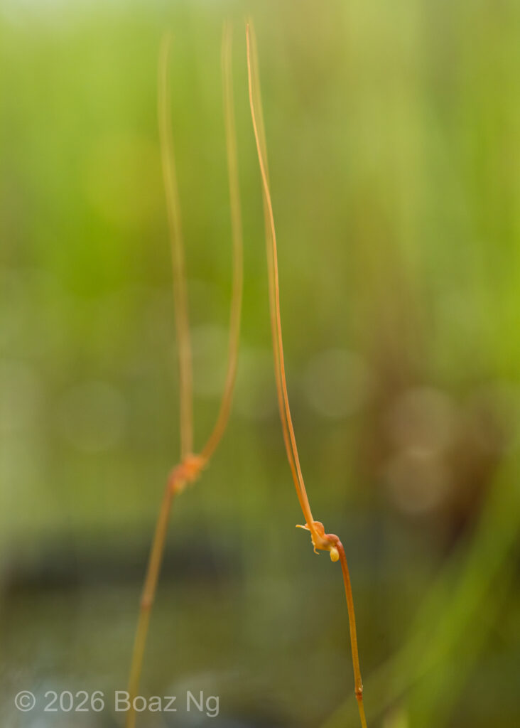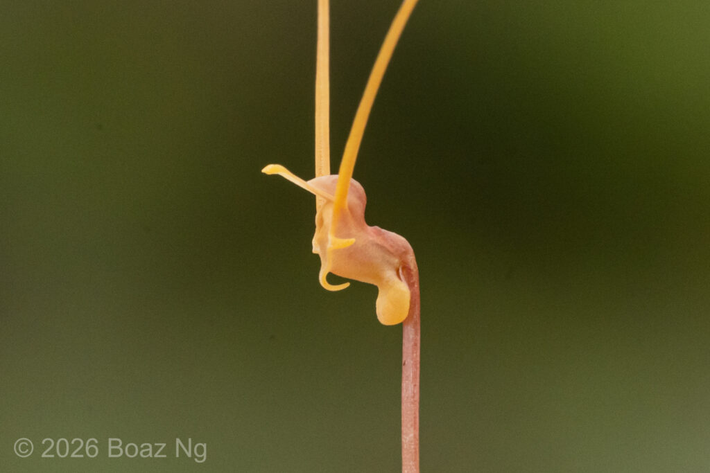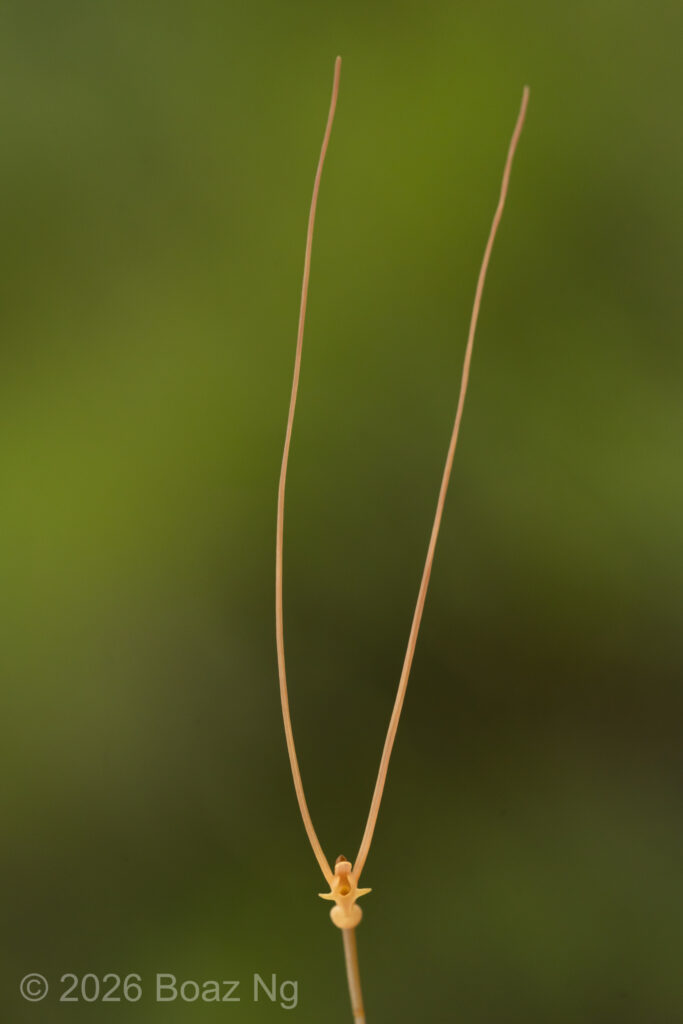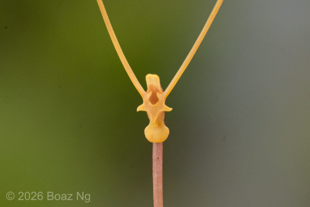 Utricularia antennifera is a small bladderwort with flowers about 2-3cm in length. Two long, thin, upwards-pointing projections emerge from the edge of the lower corolla lip. The lower edge of the corolla lip has three very short, pointed lobes that are arranged in a ‘T’ formation. The opening of the flower has an additional two inwards-pointing lobes. The upper corolla lip is simple and does not have projections. The spur is inflated to a short, round, ‘scrotiform’ structure that hangs under the corolla lobes. The flowers are a tawny orangy-yellow colour.