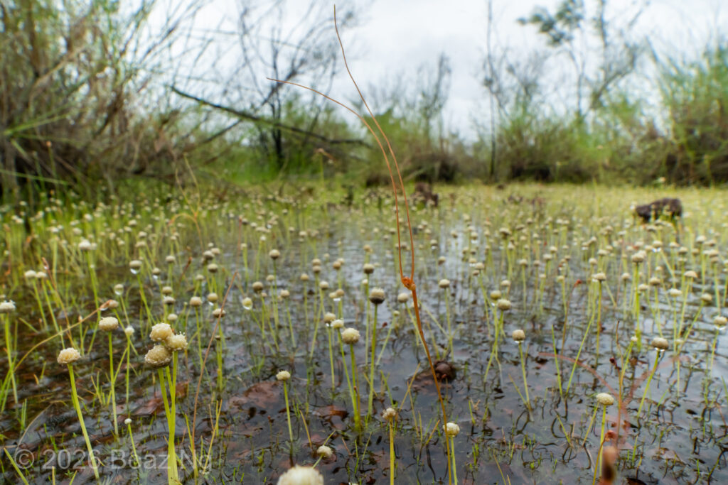 Utricularia antennifera is found alongside two other antennae-bearing bladderworts, Utricularia dunlopii and U. albertiana. In terms of habitat wetness, U. antennifera occupies moderately inundated niches with around 1cm of water. U. dunlopii grows in less wet niches that often have just a thin film of water or are very damp without any standing water. U. albertiana grows in deeper water, about 5-10cm deep.