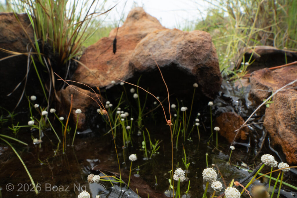 The species grows across the Northern and Central Kimberley regions in the monsoonal north of Western Australia. It is found in seepage areas atop sandstone or basalt. I observed the species north of Kalumburu where it is fairly abundant in seeps around rocky outcrop areas. It grows in niches that are usually inundated with very shallow water about 1 cm deep. Plants flower in February to April, starting towards the later half of the wet season and continuing until its habitat dries up at the start of the dry season.