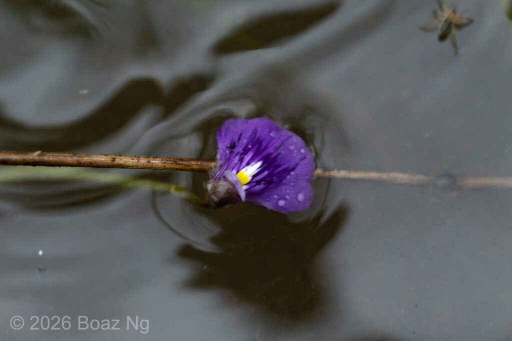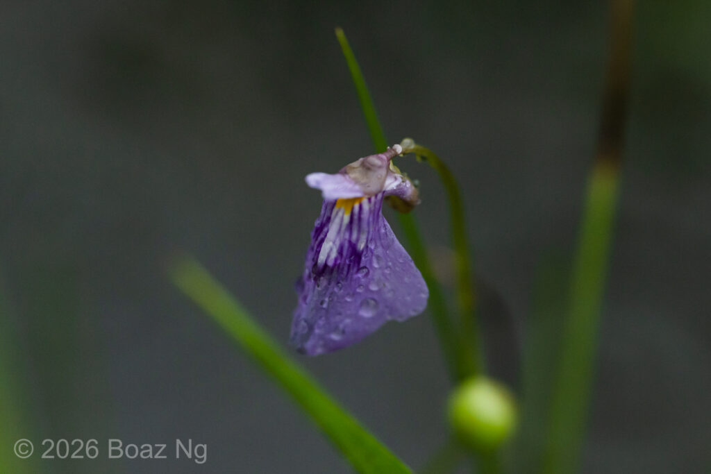 Utricularia baliboongarnang is a medium sized plant with scapes that grow to around 30-40 cm tall and flowers around 1-2 cm in length. The lower corolla lip is skirt shaped and constricted towards the centre of the bloom. The upper corolla lip is upright with a notch at the edge. The flowers are light purple in color, with white raised streaks and a yellow blotch towards the opening at the palate. The spur is broad and stubby.