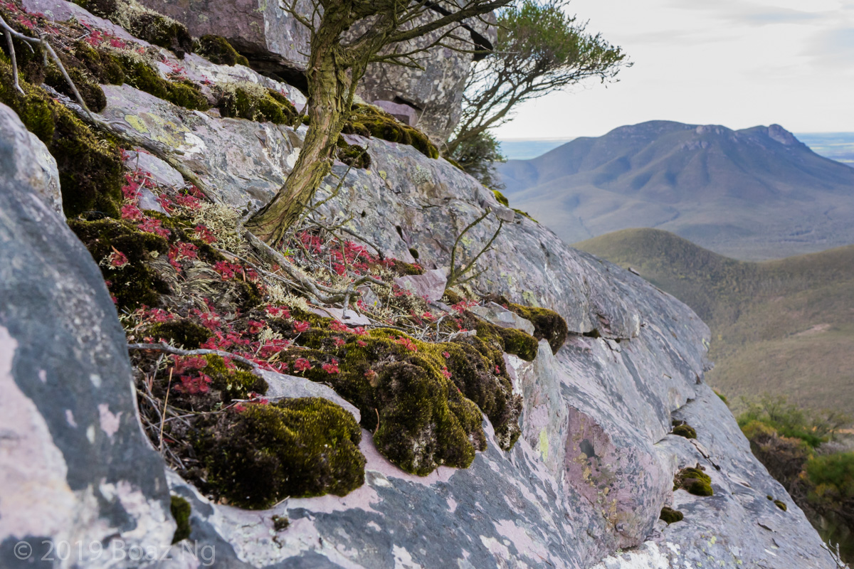 Following a bit more climbing, the heath suddenly ended and was replaced by the exposed rocky cap of the mountain. Gingerly, I scrambled on the bare rock and glanced over the usual D. glanduligera, which somehow colonises even the most remote locations, but then my eyes noticed the familiar red glimmer … of D. monticola? I was completely not expecting to see this species here as my research had indicated that it only grew on the summits of Bluff Knoll and Mt Toolbrunup. As I carefully scrambled along the steep cliff walls, I noticed many specimens growing in the moss gardens on the water seepages. In contrast to Bluff Knoll, there were limited plants alongside the track, perhaps because this peak had not burned recently and the vegetation was too dense to support sundews. Looking at the grand views before me, I wondered what other Drosera lay undiscovered on the many inaccessible peaks that dotted the range.