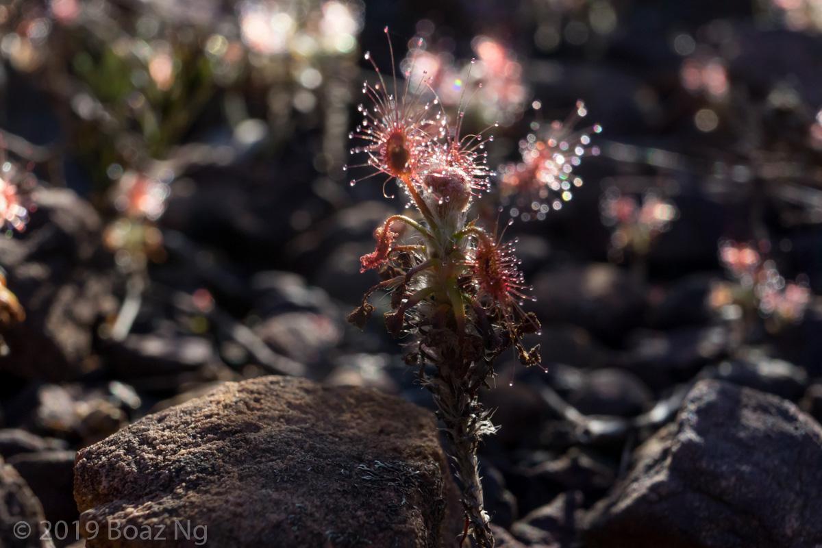 The following day we arose to summit Bluff Knoll, the highest point in the south west at 1,099 m above sea level. In testament to its height, snow had fallen a few weeks prior and the transition between the lower slopes to the extensive summit plateau is host to many interesting species of sundews. Immediately around the carpark, we noticed patches of the ubiquitous D. macrantha and D. erythrorhiza on the rocky ridge. Despite the bitter cold of the morning, our blood quickly began pumping as we hiked up the mountain. Along the steeper sections of the trail grew the interesting D. huegelii var. phillmanniana. This diminutive variation of the species grows only a few leaves on a short stem but retains a proportionally oversized flower.